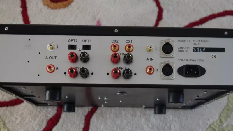 Forforsterkeren, Aura Fidelity Alpha 100, har 2 analoge innganger, da i form av en XLR og en RCA. På utgangssiden finnes samme oppsett, men her anbefaler jeg så absolutt XLR av støymessige årsaker. Enda mer interessant er det at forforsterkeren har en spennende DAC innebygget, her har man 2 RCA og 2 optiske innganger å velge i. Effekttrinnet har både XLR og normale RCA-plugger, igjen, bruk XLR. Aura Fidelity Alpha Power er en renraset dual mono-løsning, og veier inn solide 27 kilo når du lemper den over på badevekta. Under drift blir den litt mer enn middels varm, hvilket betyr en viss mengde tomgangsstrøm, normalt betyr det noen Watt i klasse A, men Fragoso tenker litt annerledes, som nevnt, så det skulle ikke undre meg om det er noe helt annet denne forsterkeren varmer seg på. Men inntil det motsatte er bevist, går jeg for et par – tre Watt i klasse A! Effektforsterkeren leverer ellers i utgangspunktet 250 Watt i hver kanal ved 8 Ohms belastning, noe mer i 4 Ohm. Det er nok for de aller fleste anledninger, ferdig pratet.